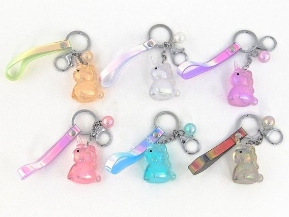 Brelok jednorożec, wys.5,5cm, przezroczysty z płynnym brokatem, z zawieszką neonową, całość 16cm
