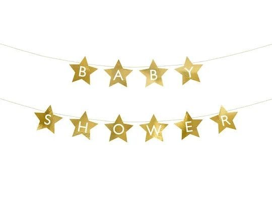 Baner w kształcie gwiazdek z napisem Baby Shower wykonany z papieru w kolorze złotym, wymiary sznurka ok. 3m.