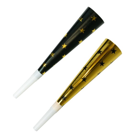 Imprezowe trąbki, czarne oraz złote tuby papierowe w gwiazdki. Zakończone plastikowym ustnikiem. Zabawny gadżet na każdą imprezę, do uczczenia solenizanta lub witania Nowego Roku. Trąbki o długości 20 cm. W opakowaniu znajdują się 4 sztuki.