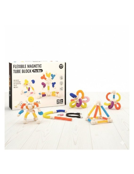 Połączenie elastyczności i magnetyzmu: zestaw składa się z magnetycznych kulek oraz giętkich, rozciągliwych rurek, dzięki którym można tworzyć zarówno sztywne ramy, jak i elastyczne połączenia.