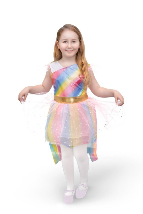 Tęczowa sukienka z dodatkiem mieliącego się tiulu Idealna na karnawał oraz imprezę tematyczną Rozmiar: M (120-130 cm)