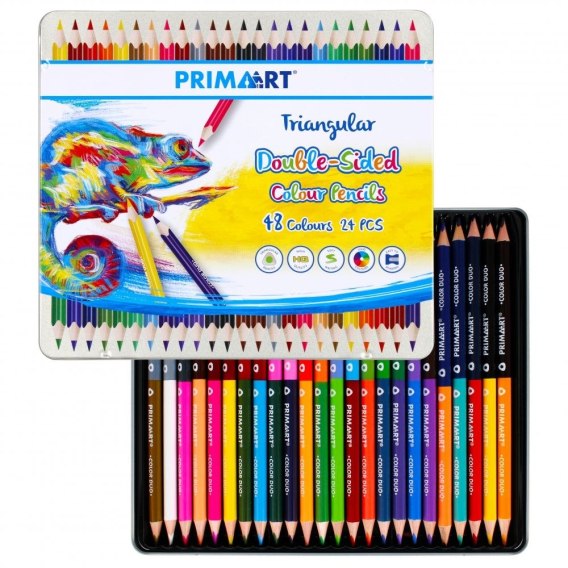 Zalety produktu: Kredki dwustronne w żywych kolorach o wysokiej jakości rysików zapewniają łatwość rysowania i dokładne pokrycie malowanej powierzchni. Nie łamią się podczas strugania, kredki trójkątne. Zestaw 24 kredek ołówkowych dwustronnych w 48 kolorach z kolekcji PRIMA ART. Zapoznaj się również z innymi produktami PRIMA ART Zawartość opakowania: 24 szt. trójkątnych kredek ołówkowych dwustronnych. Kredki wykonane z drewna. Wymiary/waga: wymiary produktu dł. cm : 18 cm, wymiary opakowania dł. x wys. x gł. cm : 21x19x2, waga produktu w opakowaniu kg : 0,31 kg. Nieodpowiednie dla dzieci poniżej 3 lat. Zapakowane w metalowe, zamykane pudełko, ułatwiające przechowywanie. Pakowane iner 12 szt. Karton 72 szt.