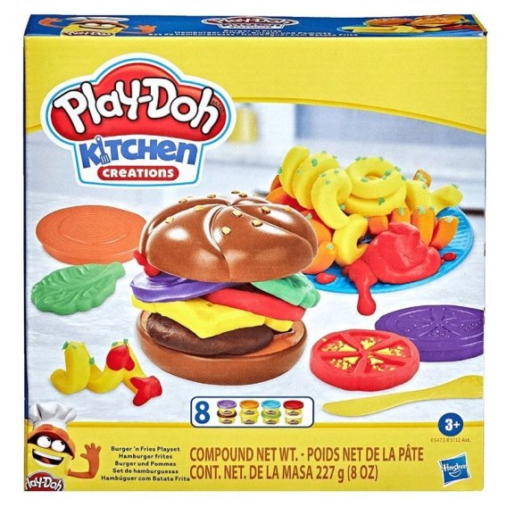 Zestaw Play-Doh Burger i frytki to nowy zestaw od Play-Doh będący idealnym prezentem dla wszystkich dzieci, a zwłaszcza tych które lubią twórczą i kreatywną zabawę. Dzięki temu zestawowi przygotujesz wyjątkowego burgera z frytkami. Jakie lubisz najbardziej - proste czy zakręcone? Przygotuj bułkę, dodatki według uznania, od sałaty przez ser po mięso, frytki do tego i gotowe! Zestaw jak z fast food'u!