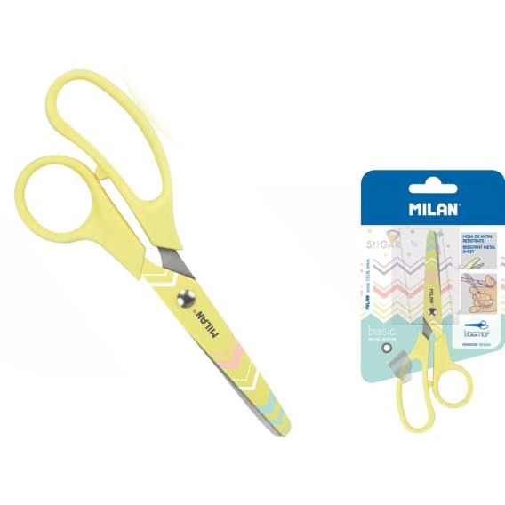 Nożyczki szkolne BASIC PASTEL SUGAR DIAMONDS z ostrzem tego samego koloru co plastikowa rączka. Długość 13,3 cm. Ostrze ze stali nierdzewnej z zaokrągloną końcówką. Idealne do użytku szkolnego. Oryginalny produkt stworzony przez własny dział badawczo-rozwojowy MILAN. Rozmiar nożyczek: 13,3 x 5,3 x 1,1 cm.