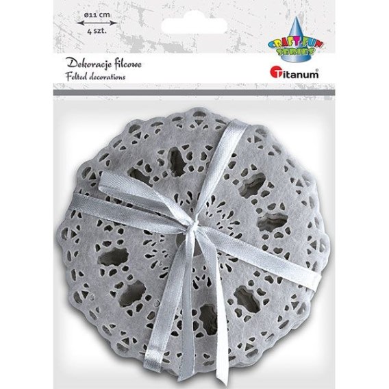 Podkładki z ażurowym wzorem, wykonane z filcu o grubości 2,5 mm. Okrągłe, jasnoszare, średnica 110 mm. Opakowanie 4 szt.