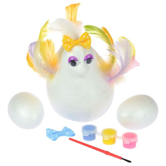 Zestaw kreatywny składający się ze styropianowego kurczaka, dwóch styropianowych jajek, trzech farbek z pędzelkiem, kolorowych piórek dekoracyjnych oraz ruczających się oczek i uroczych kolorowych kokardek
