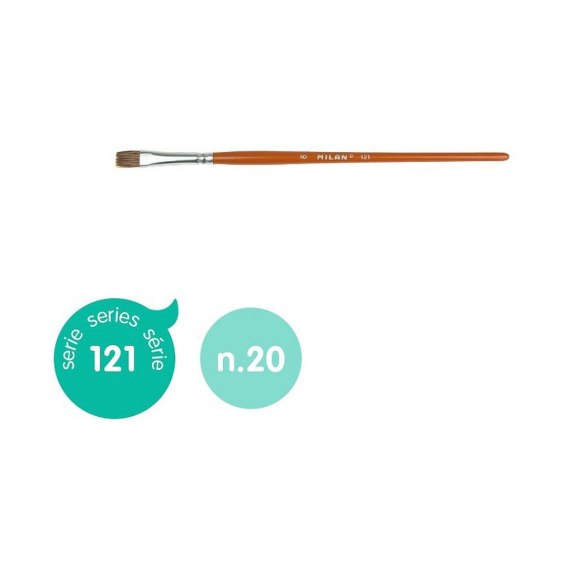 Szkolny płaski pędzel serii 121 nr 20 z krótkim drewnianym trzonkiem. Skład: 70% naturalnego włosia koziego + 30% syntetyczne. Brązowe lakierowane wykończenie i aluminiowa skuwka bez spawania, odporna na rdzewienie. Bardzo miękkie włosie idealne do technik akwarelowych, wodnych i plakatowych. Lepsze zatrzymanie wody i farby. Gładsza linia. Lepsza odporność i elastyczność, co ułatwia odzyskanie kształtu po jego użyciu. Szerokość włosia: 14,8 mm. Grubość włosia: 4,1 mm. Długość włosia: 18,2 mm. Długość pędzla: 201 mm.