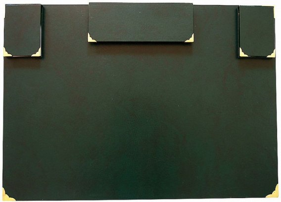 -Podkład na biurko z okutymi narożnikami, -wyposażony w piórnik, -dwa notesy z wymiennymi blokami oraz kalendarze na trzy kolejne lata. -Blat z płyty pilśniowej o wymiarze 700x500mm, -oprawiony okleiną powlekaną PVC. -kolor zielony