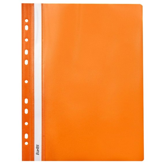Klasyczne skoroszyty w formacie A4, wykonane z polipropylenowej folii. Przednia okładka o grubości 120 mic. jest przezroczysta dla doskonałej widoczności dokumentów. Tylna okładka o grubości 170 mic. została wykonana z nieprzezroczystej, pomarańczowej folii. Metalowe wąsy bezpiecznie mocują dokumenty w skoroszycie. Na grzbiecie znajduje się wymienny pasek do opisu zawartości. Uniwersalna perforacja umożliwia wpięcie skoroszytów do każdego segregatora.