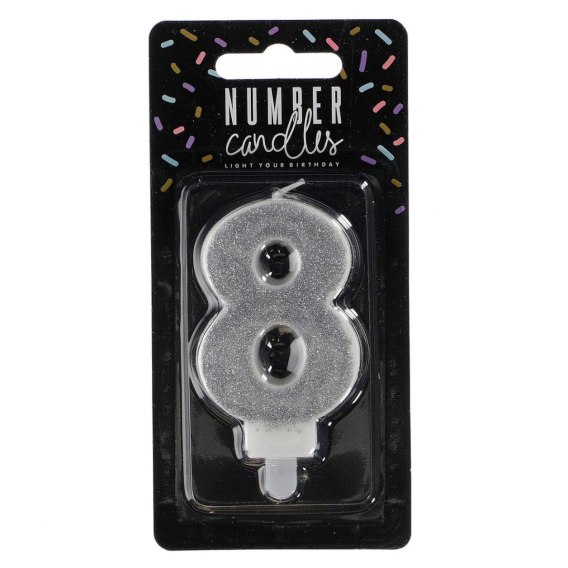 Świeczka urodzinowa Cyferka 8 w kolorze srebrnym, rozmiar ok. 7 cm.
