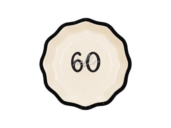 Talerzyki papierowe ''Hello 60''. Kremowe talerzyki na 60 urodziny z czarnymi elementami i srebrnym, błyszczącym napisem Hello. Mix kolorów, średnica około 18 cm. (1 op. / 6 szt.)