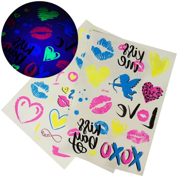 Tatuaże walentynkowe świecące w UV z motywami serc, amorków i ust to efektowny dodatek do wieczornych imprez. Idealnie pasują do dekoracji neonowych wydarzeń, nadając atmosferze niepowtarzalny, romantyczny akcent. Wymiar arkusza: 14,5x21 cm. Zalety produktu: - efekt UV idealny na nocne imprezy, - wzory przyciągające uwagę, - łatwa i bezpieczna aplikacja, - dodają zabawnego akcentu do każdego stroju. Świetny dodatek na Walentynki, który wzbogaci każdą dekorację - warto zamówić i wykorzystać w wyjątkowych aranżacjach! INSTRUKCJA UŻYCIA: 1. Wyciąć tatuaż. 2. Usunąć folię ochronną. 3. Ostrożnie przykleić tatuaż na suchą i czystą skórę. 4. Zwilżoną gąbką lub szmatką nawilżyć papier. 5. Poczekać 20-30 sekund, odkleić papier. Pozwolić tatuażowi wyschnąć. W celu usunięcia tatuażu, natrzeć go olejkiem. Ostrzeżenie. Produkt nieodpowiedni dla dzieci w wieku poniżej 3 lat ze względu na małe elementy, które mogą zostać połknięte lub wchłonięte. Przed podaniem dzieciom do zabawy usunąć opakowanie. Nie używać w okolicach oczu, ust i wrażliwej skóry. INGREDIENTS: Polyvinyl Butyral, Acrylonitrile/Methyl Methacrylate/Vinylidene Chloride Copolymer, Dipropylene Glycol Dibenzoate, Polyvinyl Alcohol, Glycine Soja Oil, C12-20 lsoalkane, Acid Yellow 3 Aluminium Lake, Pigment RED 57:1, CI 74160, Carbon black, Titanium Dioxide/CI 77891, Colouring agent CI 45170/Colouring agent CI 45170:1(Basic Violet 10), Ethyl Acetate, Colophonium, Ammonium Chloride, Isobutylphenoxy Epoxy Resin, Propylparaben.
