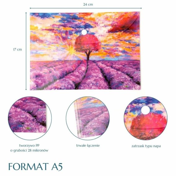 Teczka kopertowa VISTA Lawenda Narcissus, format A5 Ozdobna teczka kopertowa VISTA, wykonana z trwałego polipropylenu z nadrukiem w postaci impresjonistycznego pola lawendy. Zamykana na zatrzask typu napa. Dzięki pełnemu zadrukowi, zawartość teczki pozostaje niewidoczna na zewnątrz. Idealne rozwiązanie do przechowywania dokumentów lub niewielkich płaskich przedmiotów. Specyfikacja: • format A5 (240 x 170 mm) • wykonana z polipropylenu • zamykanie na zatrzask typu napa • grubość tworzywa 28 mikronów