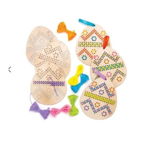 Zestaw kreatywny do samodzielnej dekoracji drewnianej pisanki. Drewniane jajko posiada otwory, przez które należy przewlekać mulinę tworząc kolorowe wzory jak w hafcie. W zestawie znajdują się trzy drewniane bazy w kształcie jajka o rozmiarze około 11,5 x 9,5 cm, trzy kolory muliny oraz plastikowa igła do przewlekania sznurka.