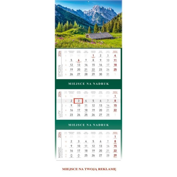 Kalendarz ścienny plecki zielone kalendarz trójdzielny GÓRY 850mm x 295mm Wydawnictwo Wokół Nas (KS 055)
