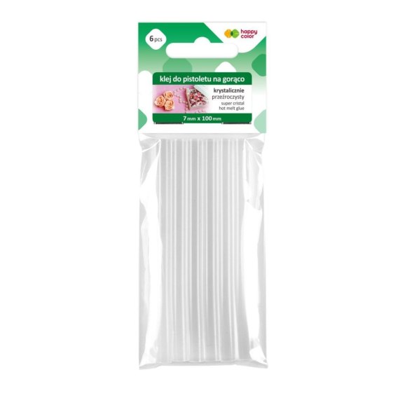 Krystalicznie przezroczysty, również po zaschnięciu, co daje efekt wyjątkowej estetyki wykonanej pracy. Klej w formie lasek, ale i po użyciu nie żółknie, nie zawiera kalafonii.
