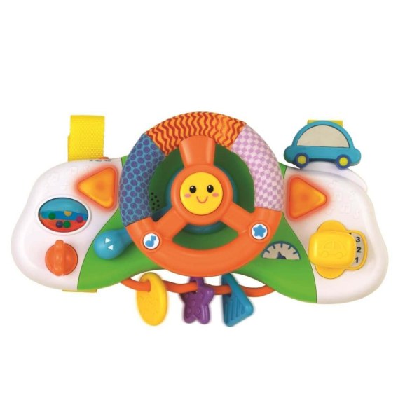 Zabawka naśladuje prawdziwe auto. Jest tu ruchoma kierownica z działającym klaksonem, a na niej 2 dodatkowe przyciski z dźwiękami i melodyjkami. Aby włączyć zabawkę, należy przekręcić kluczyk w stacyjce. Przesuwając dźwignię zmiany biegów, dziecko ćwiczy sprawność dłoni. Przełącznik kierunkowskazów to doskonałe ćwiczenie rozpoznawania strony lewej i prawej (gdy przesuniemy dźwignię do góry miga lewy migacz, a kiedy do dołu miga prawy). W bezpiecznym lusterku można zobaczyć, co dzieje się z tyłu. Dodatkowo dziecko może ćwiczyć paluszki, kręcąc kolorowym walcem lub przesuwając plastikowy krążek, gwiazdkę albo trójkąt. Powierzchnia tych elementów ma różnorodne faktury, co dodatkowo stymuluje zmysł dotyku. Część kierownicy pokryta jest materiałem, co ma znaczenie ze względu na rozwój sensoryczny dziecka.